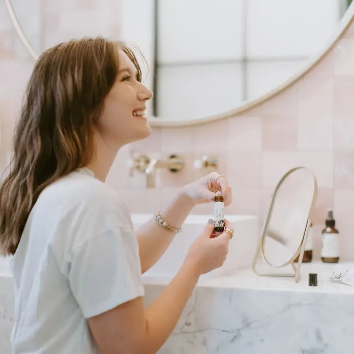Give it a little shake to mix the fragrance, then roll on pulse points like wrists, neck, and inside of the elbows.