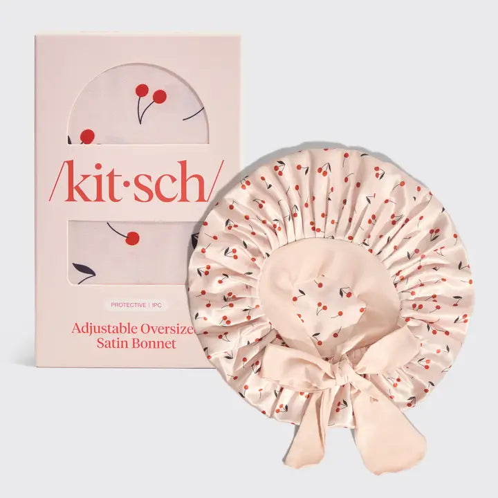 Adjustable Oversized Satin Bonnet - Cherry Print