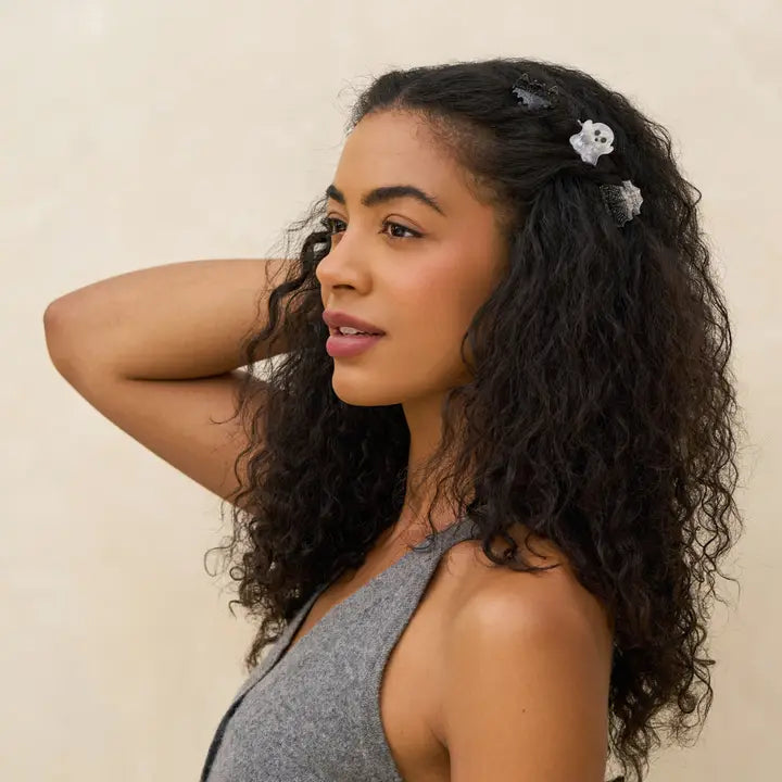 The Mini Claw Clips 6pc Set - Halloween from KITSCH is perfect for adding a spooky touch to your hairstyle this Halloween season. Crafted from recycled materials, these clips are not just stylish but also sustainable. They're a fun way to express your festive spirit and commitment to the environment. Whether you're dressing up for a party or want to add a bit of holiday flair, these clips are a hair accessory must-have. Elevate your beauty routine with KITSCH's reliable and sustainable solutions.