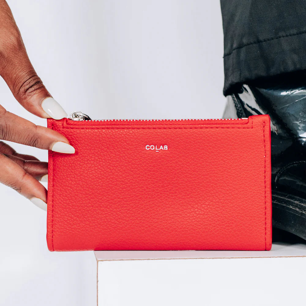 This slim wallet has 8 card holders, and a top zipper - it’s pure and made in soft textured vegan leather.